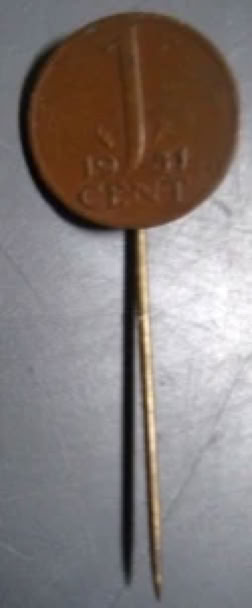 1 cent pin with original 1951 cent, made by record company to celebrate the sales of 50000 copies of the LP In the Dutch Mountains